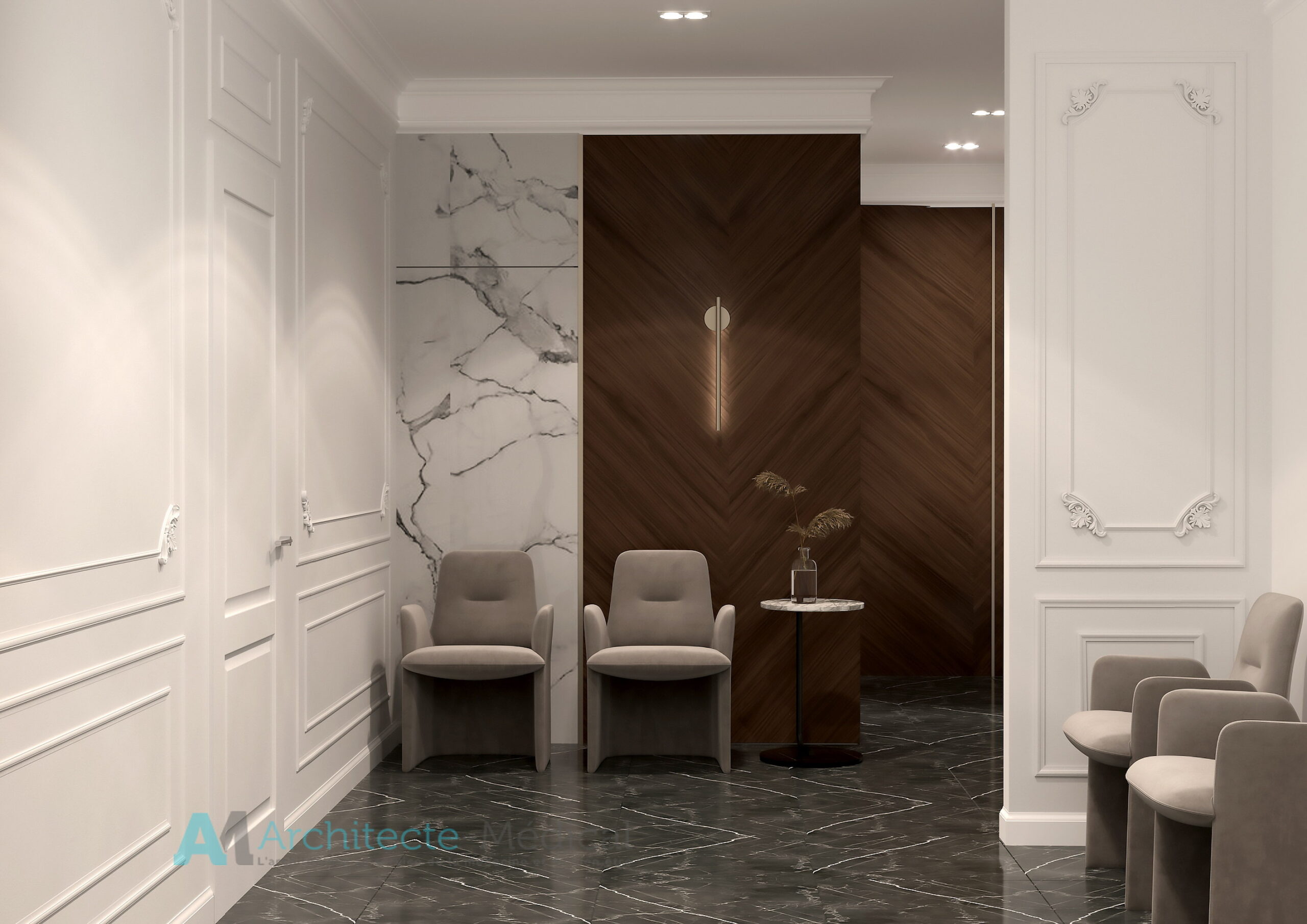 Salle d’attente : un espace chic et chaleureux, avec des assises élégantes, des revêtements en marbre et bois, et une lumière d’ambiance raffinée.