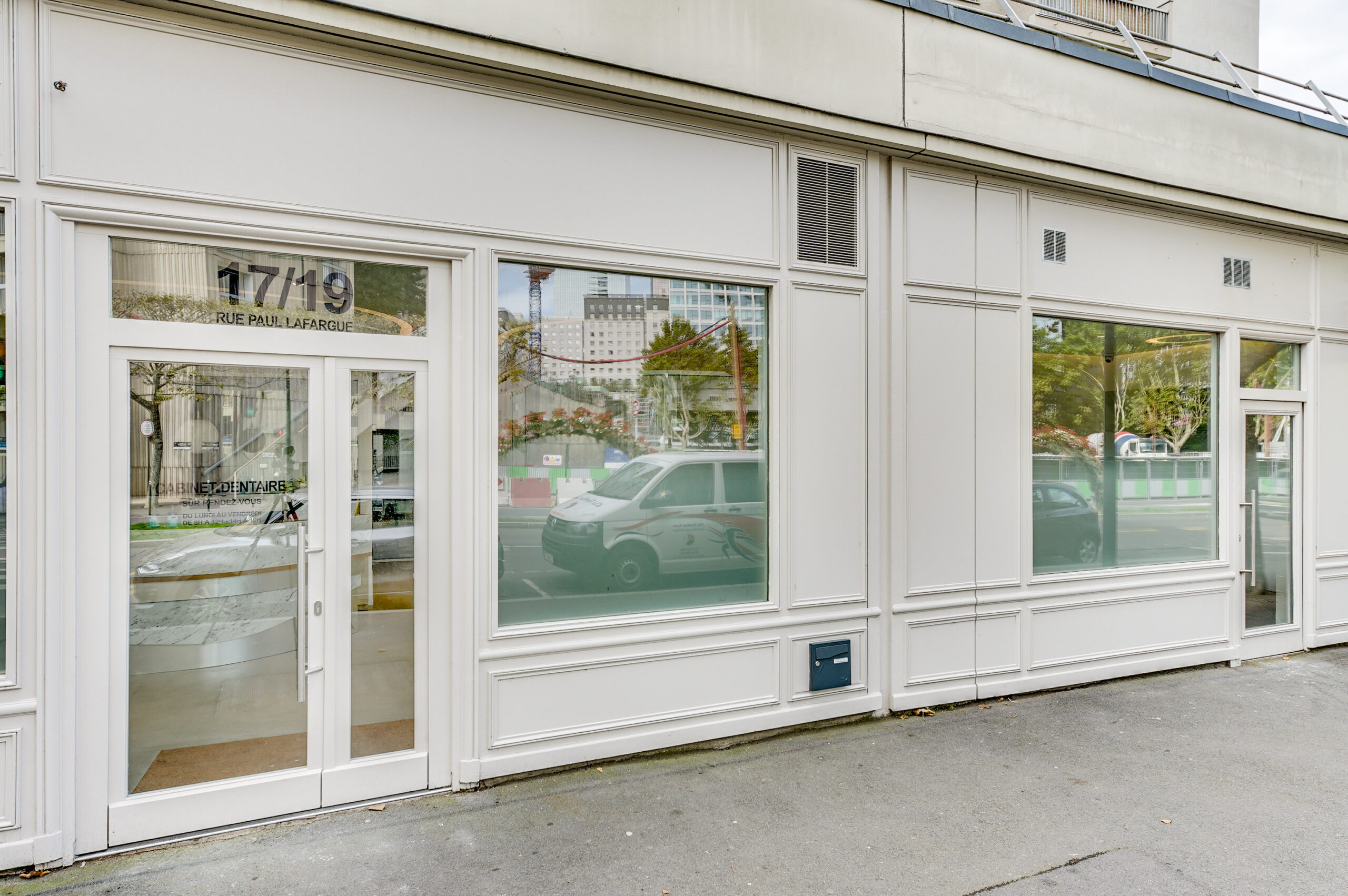 Façade extérieure : une devanture sobre et élégante avec des larges vitrines laissant entrer la lumière naturelle et mettant en avant un accès accueillant et moderne.