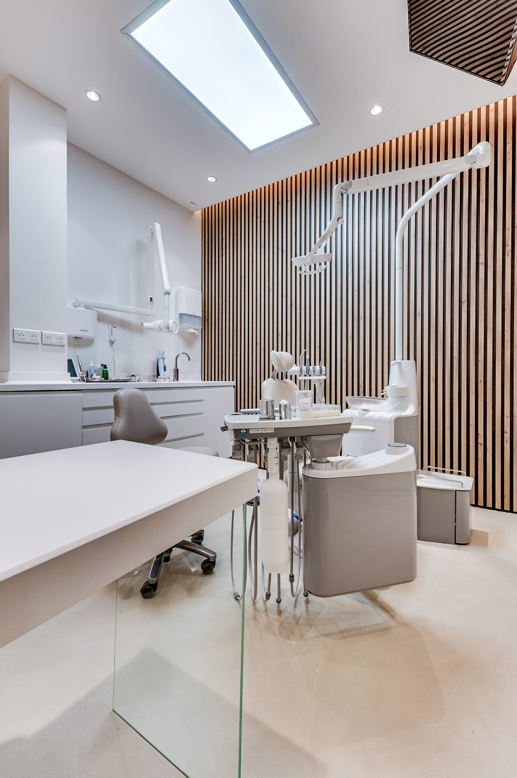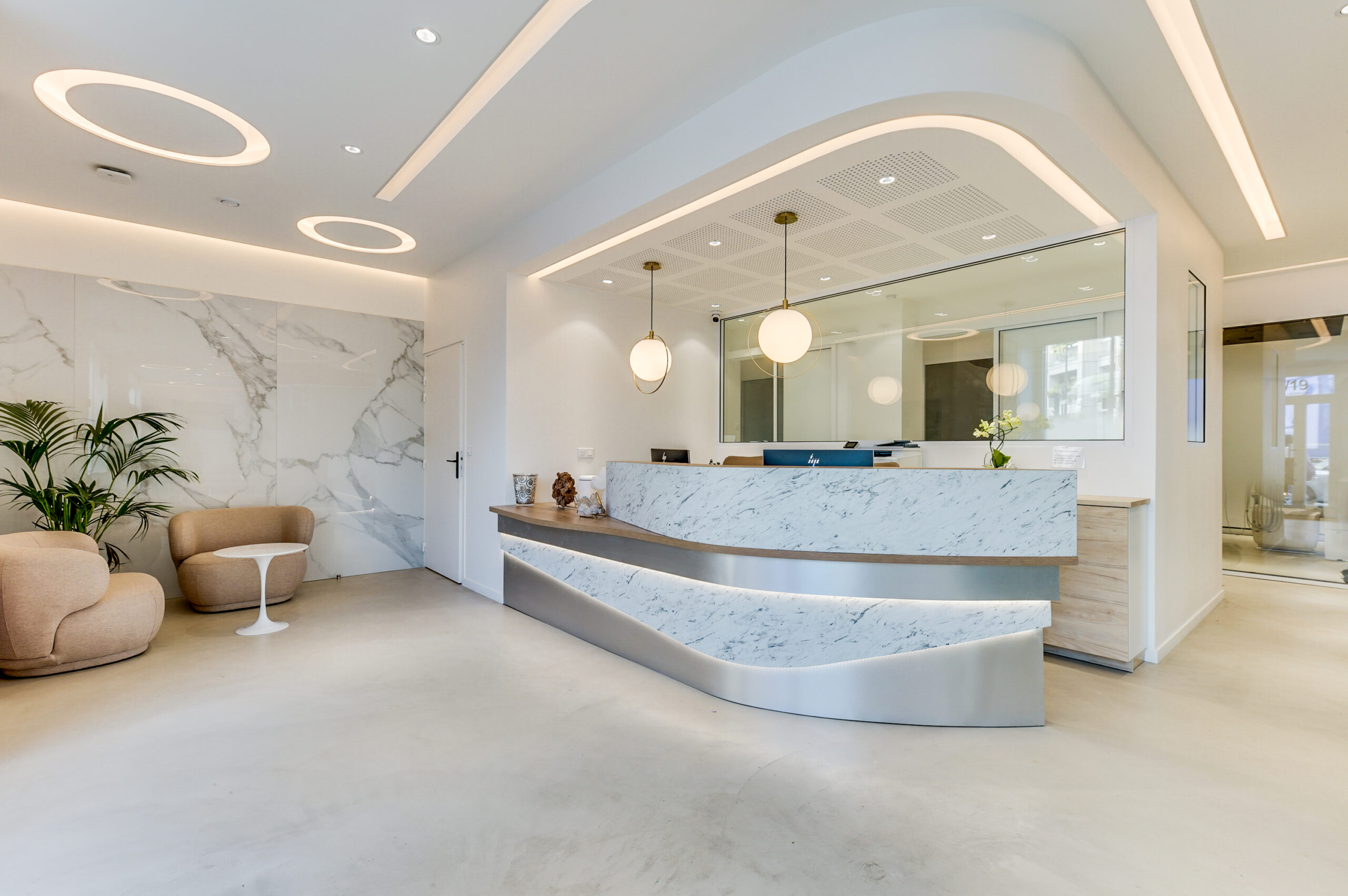 Situé à Puteaux, ce cabinet dentaire a été conçu pour offrir une expérience haut de gamme aux patients tout en garantissant un cadre de travail ergonomique et performant pour les praticiens. L’architecture repose sur une harmonie entre lignes modernes, matériaux nobles et éclairage soigneusement étudié.