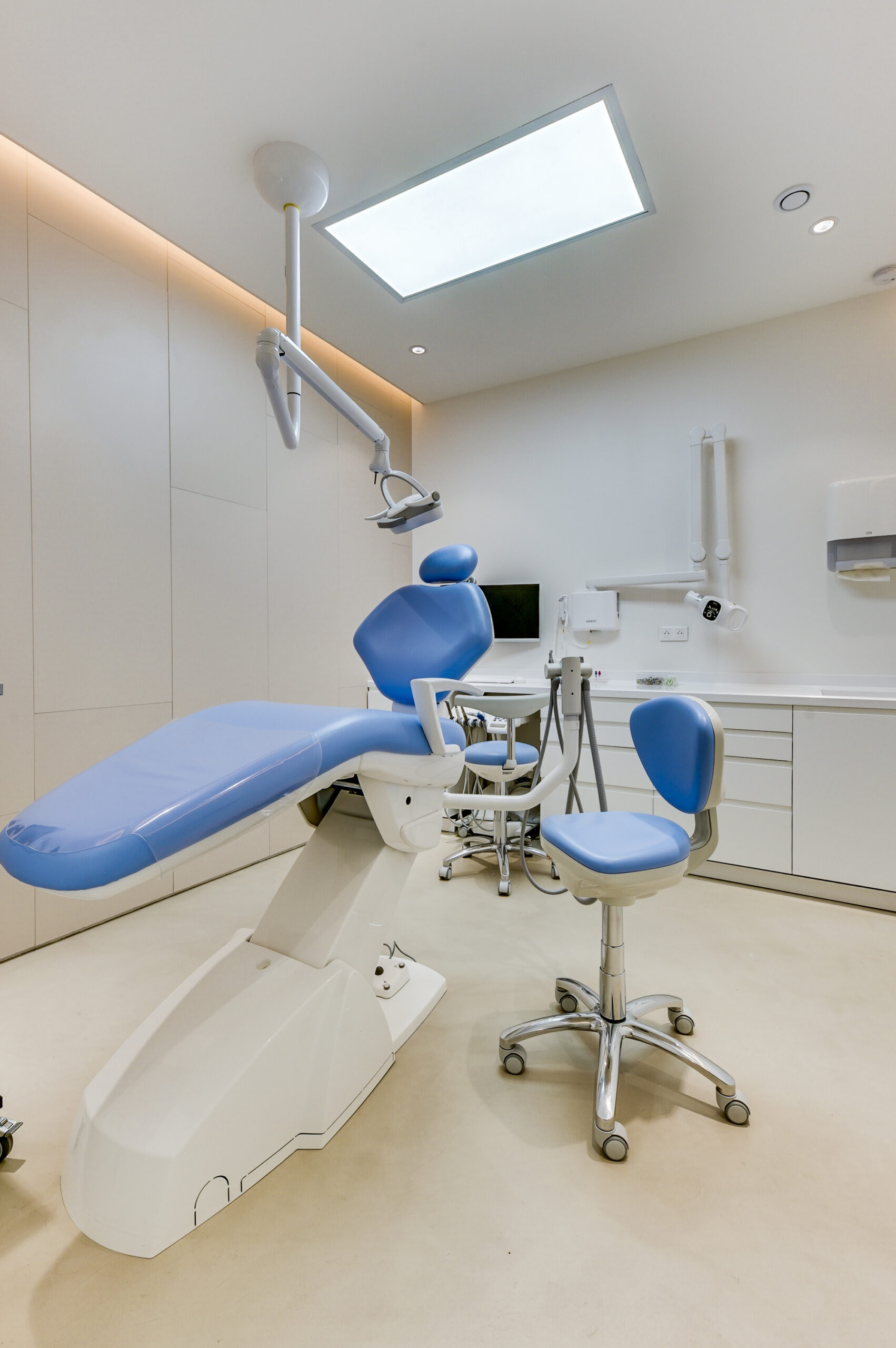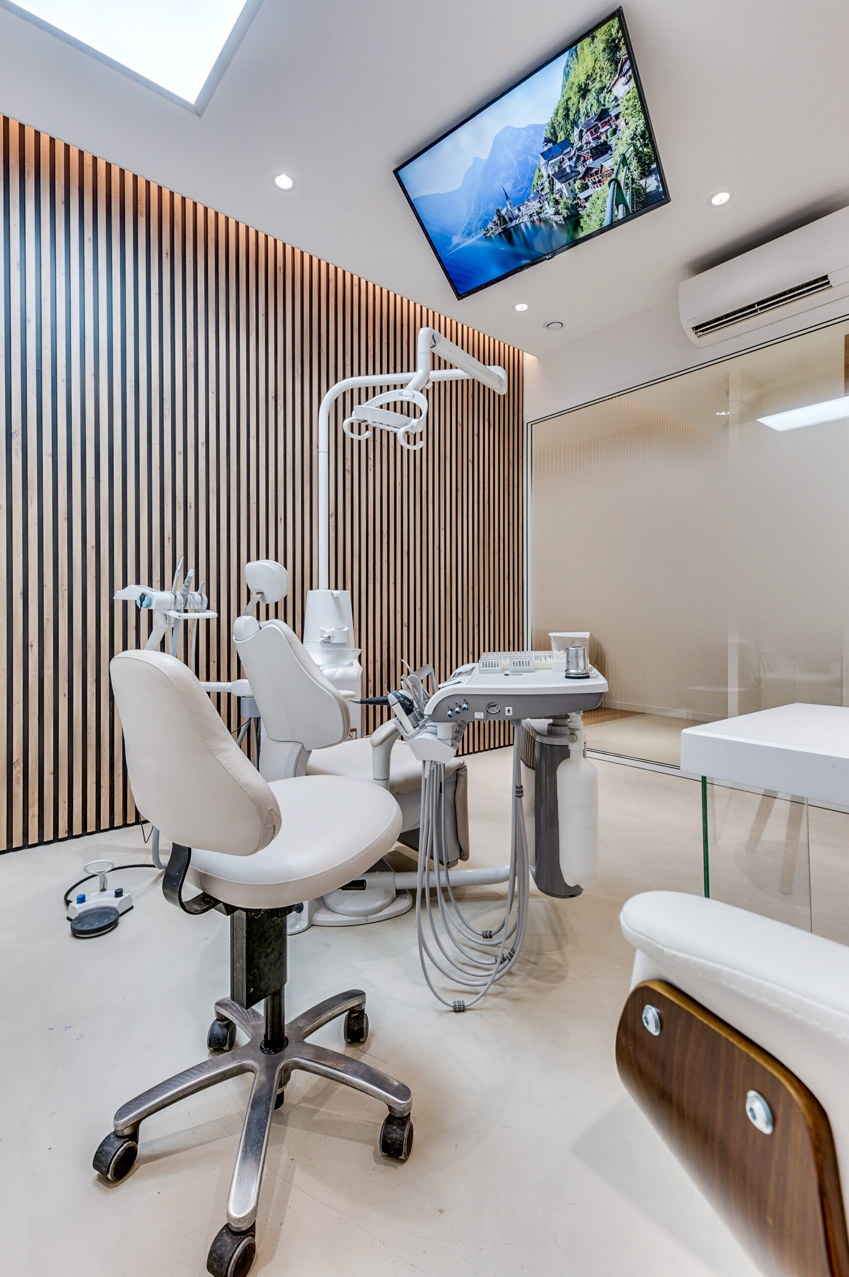 Cabinets de soins : des espaces équipés des dernières technologies dentaires, avec un agencement pensé pour optimiser le confort du patient et l’ergonomie du praticien. Les panneaux en bois ajouré apportent une touche naturelle et une isolation visuelle agréable.