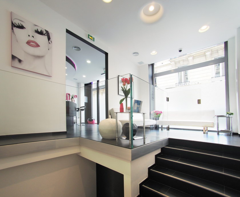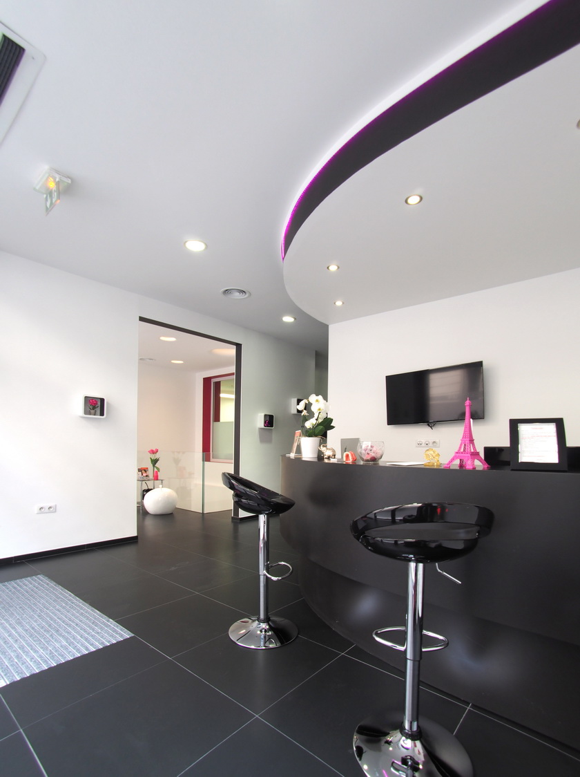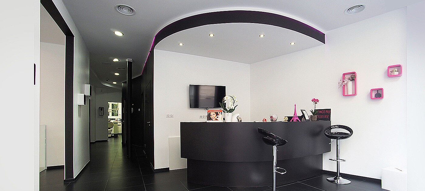 Un front‑desk en courbes douces, rehaussé d’un bandeau lumineux rose apaisant, accueille les patients dans une ambiance à la fois élégante et rassurante. Le contraste blanc-noir ajoute une touche d’élégance soignée.