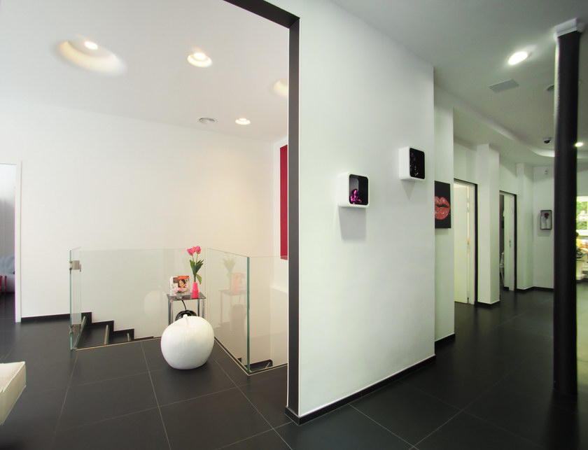 Murs blancs et finitions noires structurent l’espace. Des touches délicates de couleurs vives (fauteuils, accessoires, œuvres murales) créent un environnement chaleureux, harmonieux et humain.