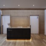 Accueil : un comptoir minimaliste en bois et pierre texturée, avec un éclairage suspendu discret, mettant en valeur la modernité de l’espace. L’ambiance épurée et lumineuse renforce l’accueil chaleureux des patients.