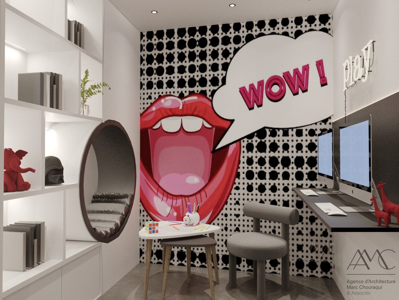 • Salle de jeux : un espace interactif dédié aux enfants avec un design inspiré du pop art, des couleurs vibrantes et des éléments graphiques accrocheurs. L’objectif est de créer un univers rassurant et stimulant pour distraire les plus jeunes avant leur consultation.
