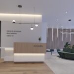 Salle d’attente : Un espace spacieux et lumineux, doté d’un mobilier moderne en courbes fluides, avec des assises confortables dans des tons gris et des touches végétales apportant une atmosphère apaisante.