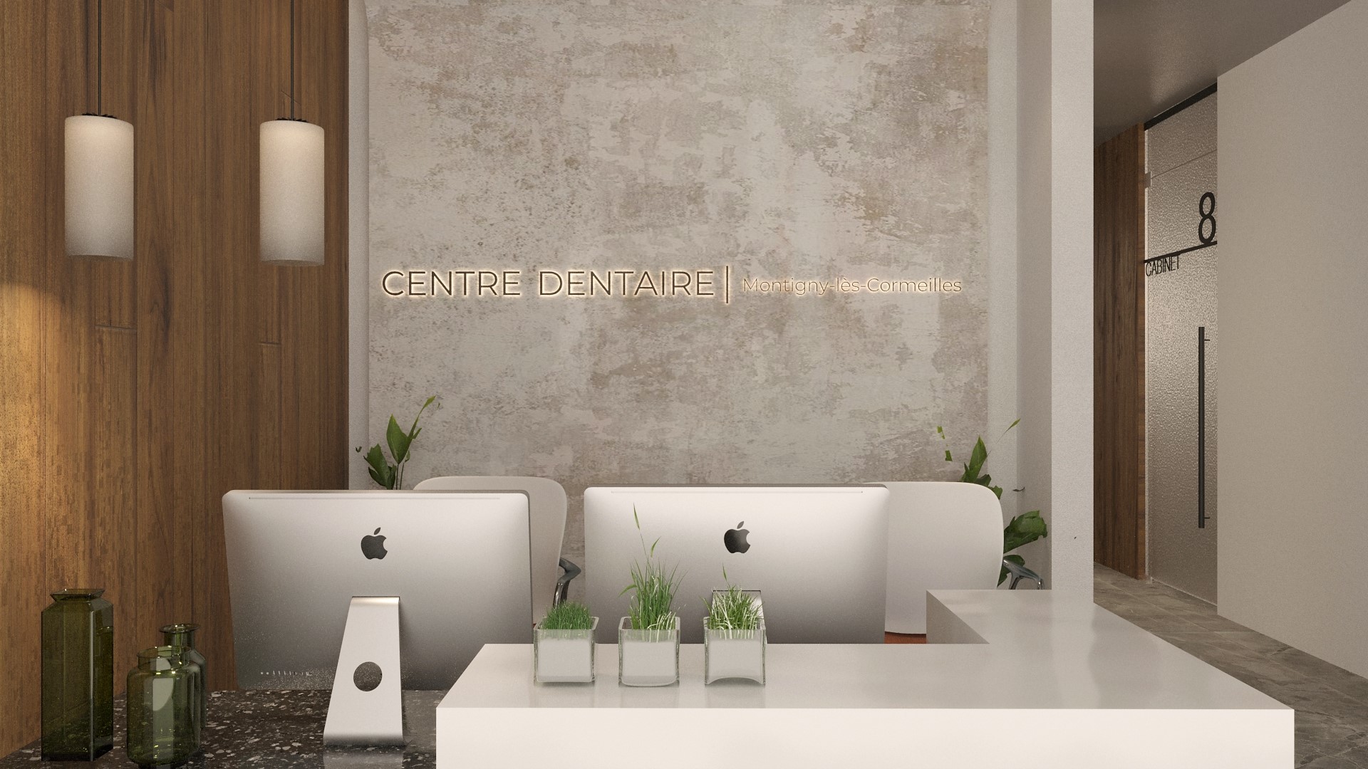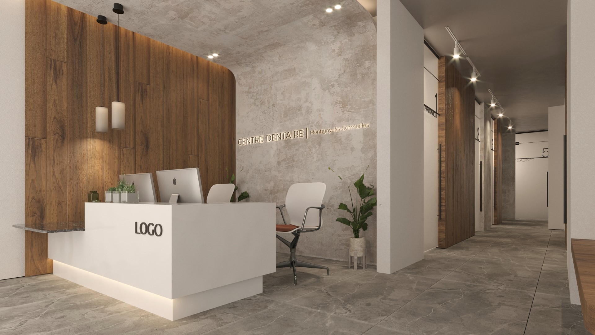 Accueil et réception : un comptoir épuré en blanc et bois, accompagné d’un mur texturé avec une signalétique lumineuse intégrée. L’espace d’accueil est conçu pour être accueillant et intuitif, avec une attention particulière à l’ergonomie et à l’accessibilité.