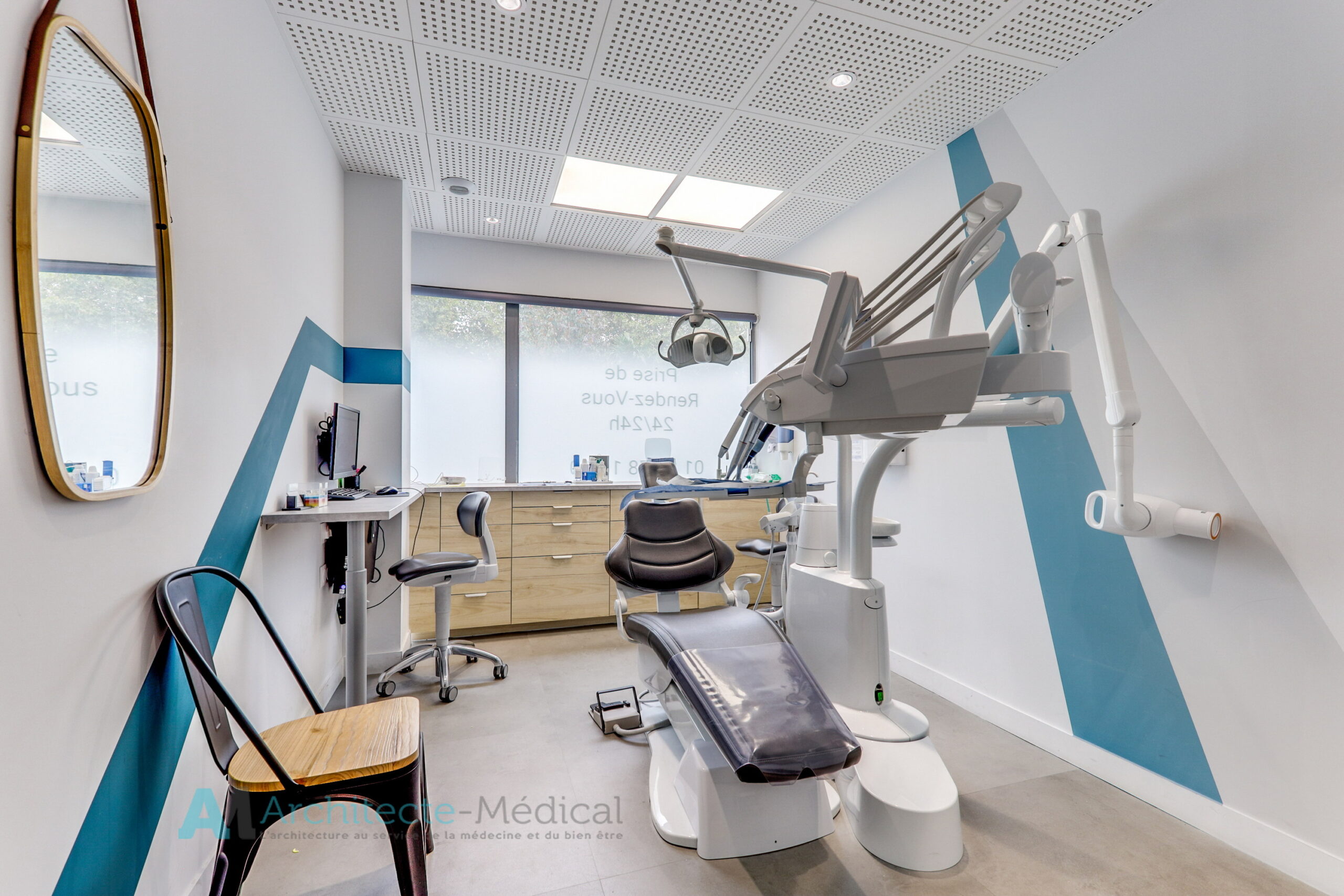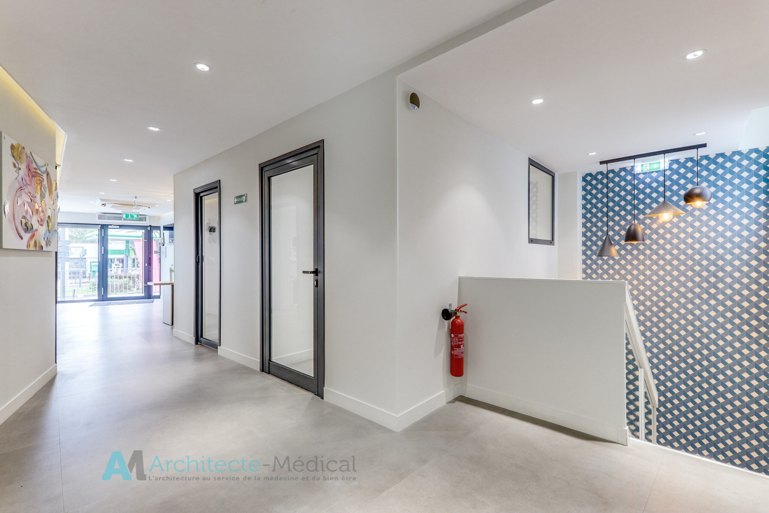 Éléments décoratifs : l’intégration de motifs géométriques et de touches de bois pour réchauffer l’ambiance et casser la froideur souvent associée aux cabinets médicaux.