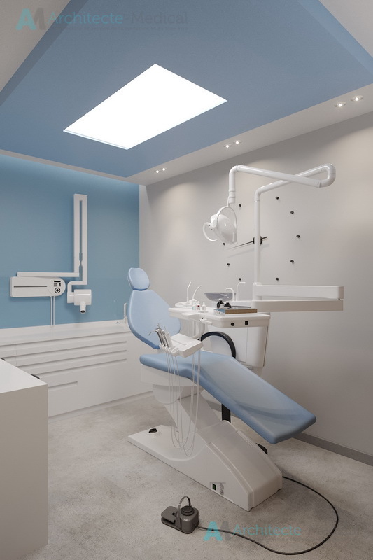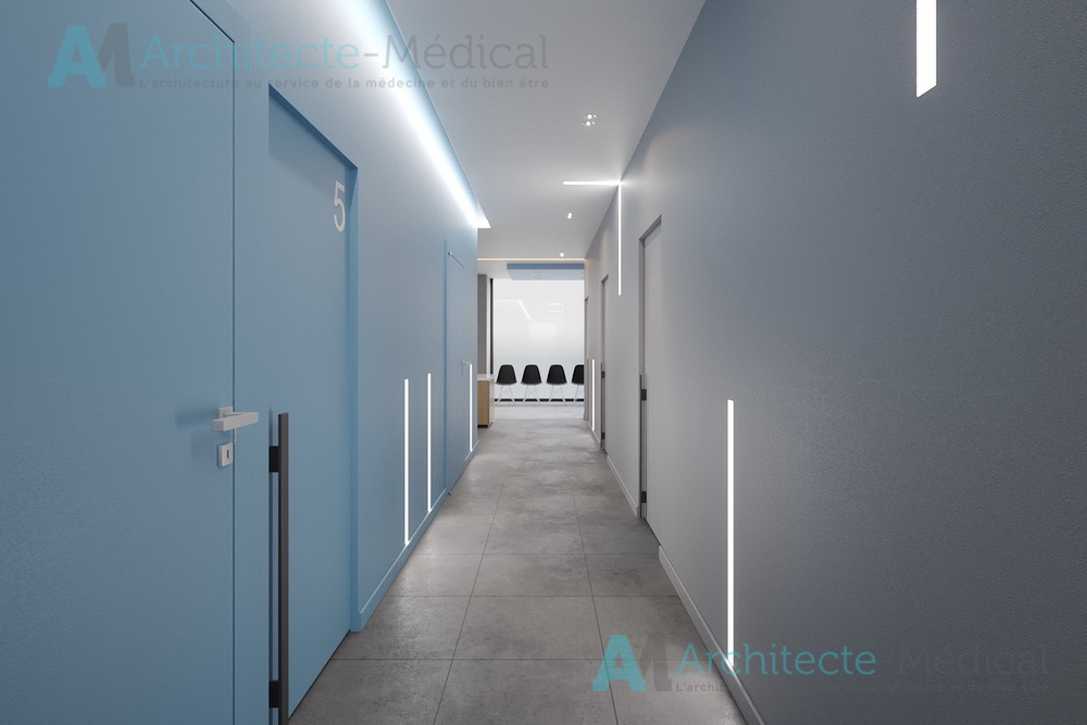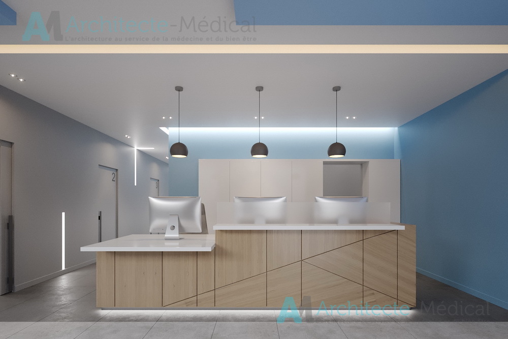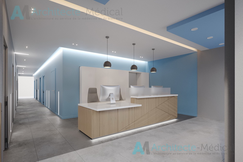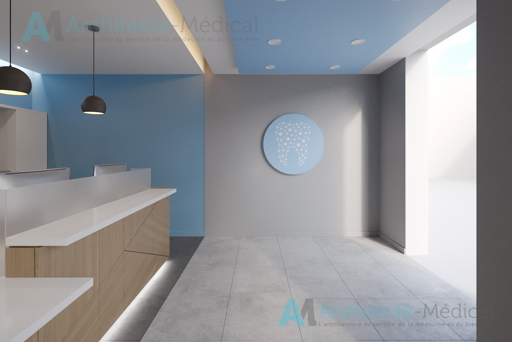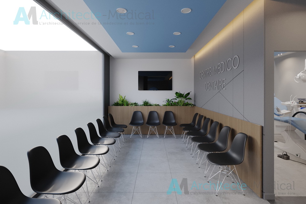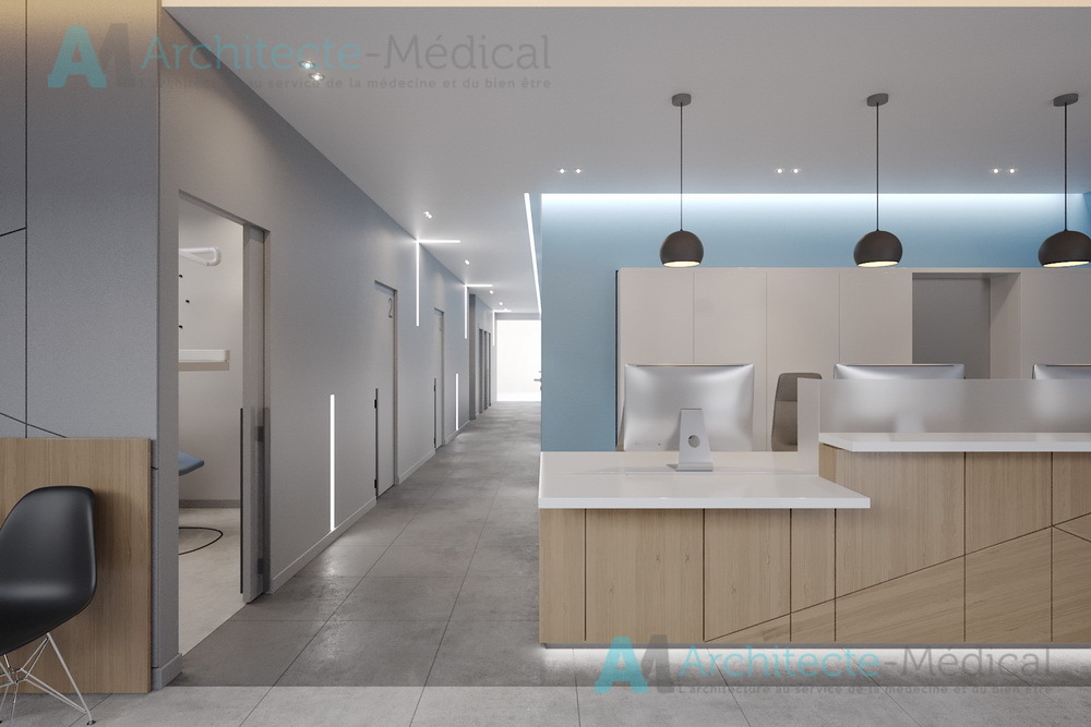 Dès l’entrée, l’agencement fluide et lumineux du centre offre une circulation optimisée entre les différentes zones : accueil, salles d’attente, bureaux médicaux, cabinets dentaires, zones techniques et espace de stérilisation. Chaque détail a été étudié pour allier ergonomie, confidentialité, hygiène et esthétique professionnelle.